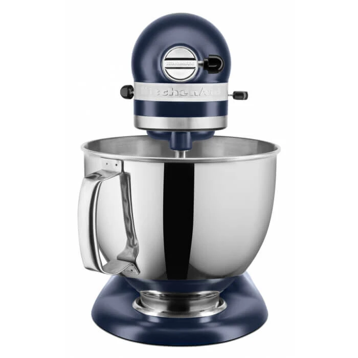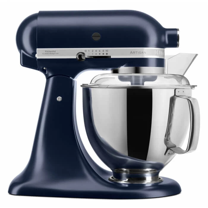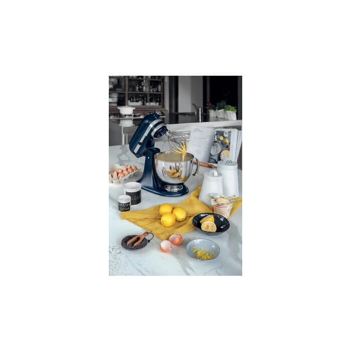 De Inktblauwe KitchenAid Artisan Elegance KSM175 standmixer is vervaardigd uit gegoten zink met een matte, blauwe coating. De machine wordt geleverd met twee roestvrijstalen mengkommen, één van 4,8 liter en één van 3 liter. Aan de voorzijde van de mixer bevindt zich een aansluitpunt voor de vele accessoires waarmee u van de KitchenAid een multifunctionele keukenmachine maakt. Deze keukenrobot mengt, roert, klopt en kneedt met groot gemak uw deeg, beslag, saus of room.