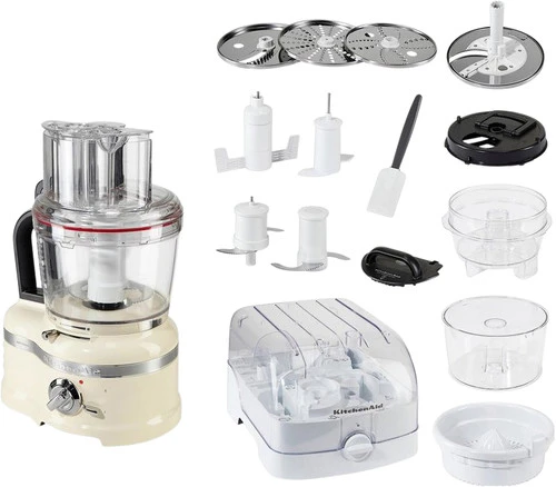 Deze KitchenAid Artisan Foodprocessor Amandelwit van gegoten metaal is robuust, stabiel en duurzaam. Je ontvangt de processor met mengkommen van 4 liter, 2,4 liter en 1 liter die in elkaar passen. De 3-delige toevoerbuis zorgt ervoor dat je aardappelen, courgettes en wortels in z’n geheel snijdt en de snijschijf verstel je gemakkelijk, waardoor je tussen de 1 en 6 millimeter dikte snijdt. Met de blokjeskit maak je snel blokjes groenten, fruit of kaas. Raspen is een fluitje van een cent door de omkeerbare raspschijf voor fijne en grove stukken en de raspschijf voor harde kazen, ijs of chocolade. Met de frietenschijf maak je in een handomdraai zelfgemaakte frieten. Tot de standaard accessoires behoren tevens een citruspers en een eierklopper. Geen zorgen over de opbergmogelijkheden, je ontvangt een opbergbox voor alle accessoires.