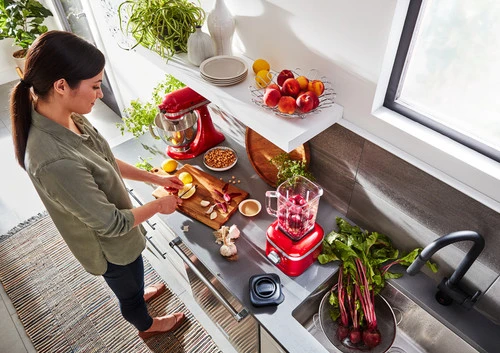 Met de KitchenAid Artisan K400 5KSB4026EKG Appelrood bewerk je zowel warme, koude als bevroren ingrediënten. Voor het fijnmalen van ijs en het maken van smoothies of ijsdrankjes beschikt deze blender over 3 automatische programma’s. Wil je soep of notenpasta maken? Gebruik dan één van de 5 snelheidsstanden of de pulsestand. Zelfs over het afmeten van ingrediënten is nagedacht. In de deksel vind je namelijk een dop waarmee je ingrediënten tot 60 milliliter afmeet. Handig, want zo heb je geen aparte maatbeker nodig. Na gebruik vul je de blenderkan met water en afwasmiddel en het reinigingsprogramma doet de rest. Is de blenderkan toch niet helemaal schoon, dan zet je hem gewoon in de vaatwasser.