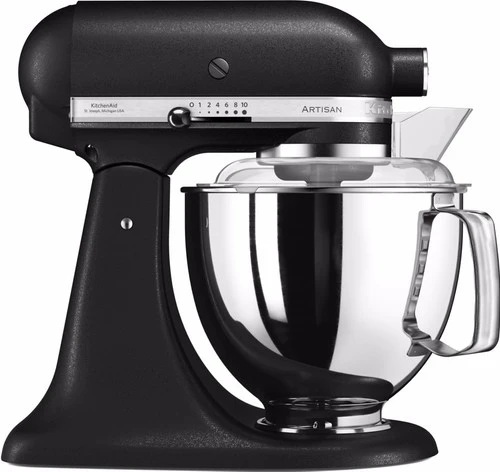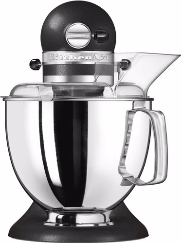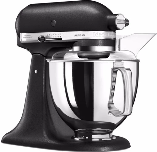 Met de KitchenAid Artisan Mixer 5KSM175PS Vulkaanzwart maak jij met weinig inspanning deeg en beslag. Deze krachtige keukenmixer heeft een vermogen van 300 watt, maar de motor bevindt zich in de kop. Hierdoor kan hij met gemak zwaar brooddeeg aan, want er gaat geen energie verloren tussen de menghaak en de motor. De kop van de KitchenAid is kantelbaar, hierdoor verwissel je de deeghaken eenvoudig. Doordat er 2 mengkommen worden meegeleverd hoef je tussendoor niet af te wassen en het antispatdeksel voorkomt een aanrecht vol beslagspetters. Wil je de mogelijkheden van je KitchenAid Artisan verder uitbreiden? Er is een groot assortiment opzetstukken verkrijgbaar. Deze bevestig je op het aansluitpunt aan de voorzijde.